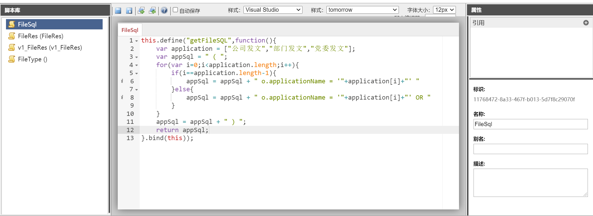 1、在内容管理应用中有一个fileRes的应用,在该应用中创建一个脚本,命名为FileSql,并定义方法。